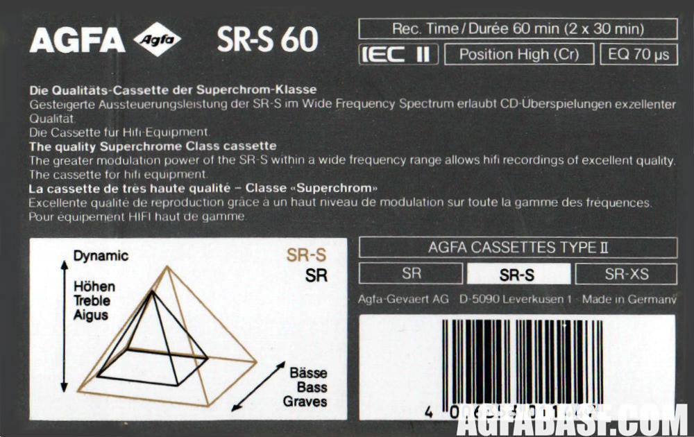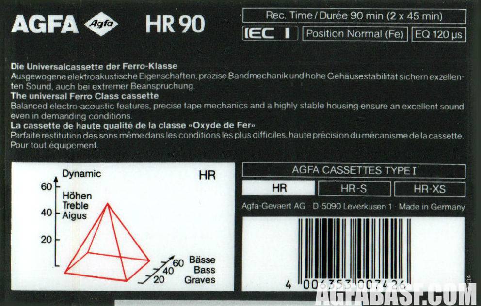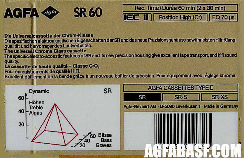 Верхние модели AGFA SR-XS, HR-XS, в отличие от более простых SR, HR имели двуслойное покрытие лент, что обеспечивало более широкий частотный диапазон. Данное преимущество было наглядно показано на оборотной стороне упаковок.