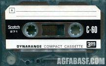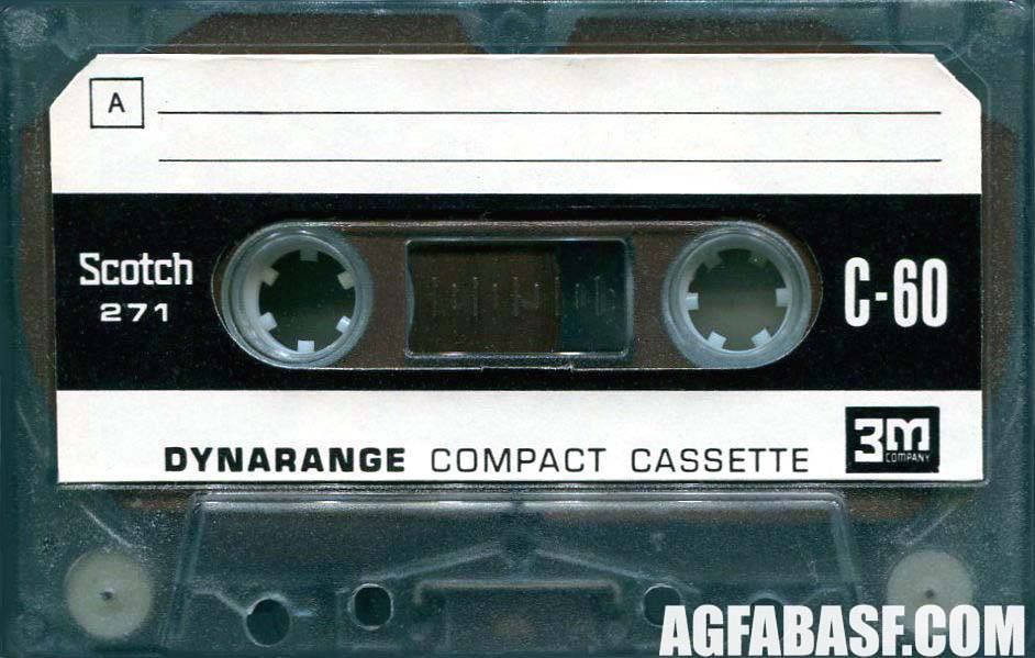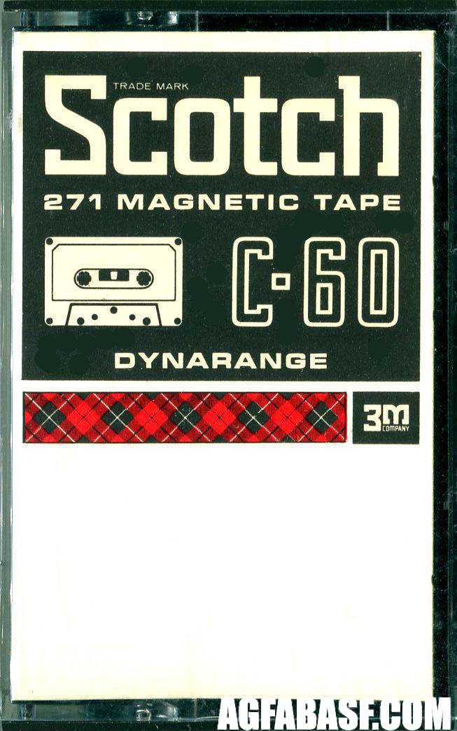 Model: Dynarange (models 271, 272)Release year: 1969Tape type: NormalMarket: EUR Первые кассеты Scotch для европейского рынка. Трехзначные номера моделей означали толщину, материал и магнитные свойства ленты. Индекс 271 имела лента C-60 для использования, в том числе, на низкой скорости. 272 - это более тонкая лента C-90. Соответственно, 273 - это еще более тонкая лента формата С-120. |