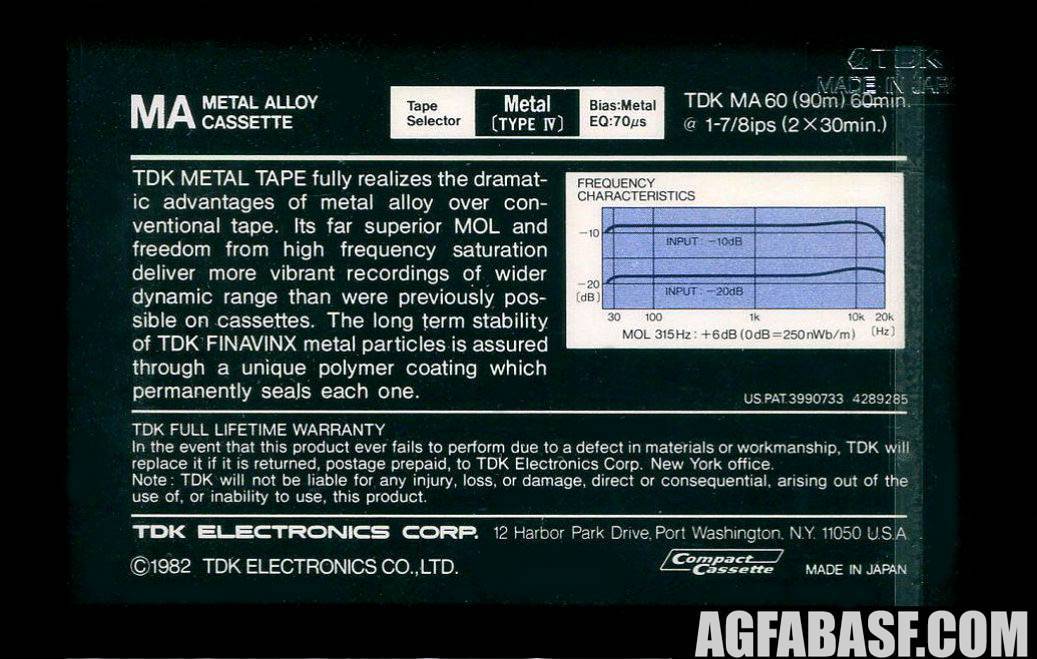 Model: MARelease year: 1982Tape type: MetalMarket: USA В 80-х модель MA можно было найти в продаже в московских магазинах "Березка" по цене 14 чеков за 60-минутную версию и 19 чеков за 90-минутный хронометраж. |
